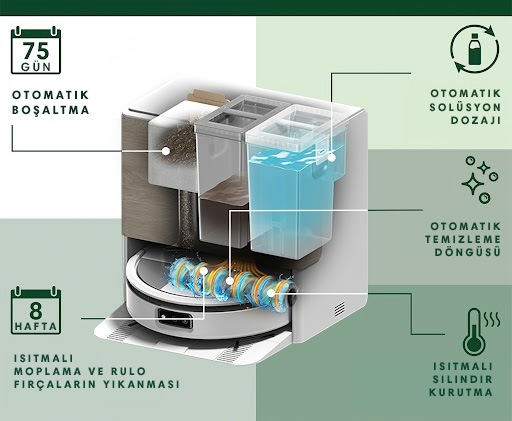 Hazneyi boşaltmadan 75 güne kadar toz ve kirleri kendi boşaltarak zahmetsiz kullanım imkânı sunar. İstasyon, maksimum hijyen ve konfor için robotun paspasını yıkar, sıcak hava ile kurutur, temizlik solüsyonunu otomatik olarak verir ve kendini temizler.