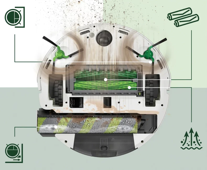 - AutoWash™ Dock: otomatik boşaltma, otomatik doldurma, paspas başlığı temizleme